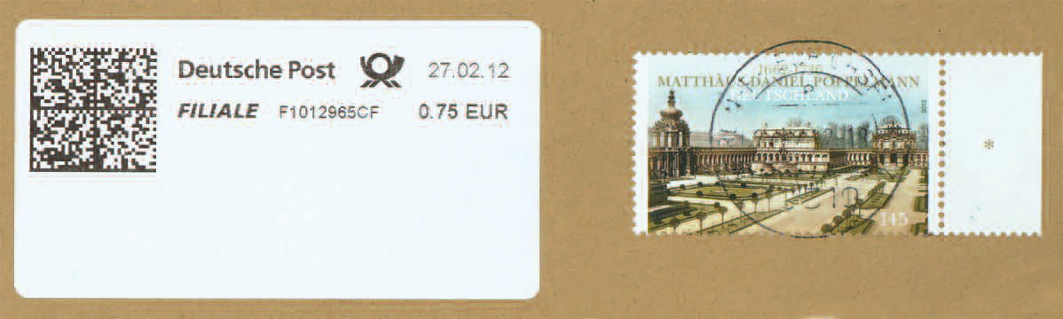 Mischfrankatur aus Briefmarke und Schalterlabel.