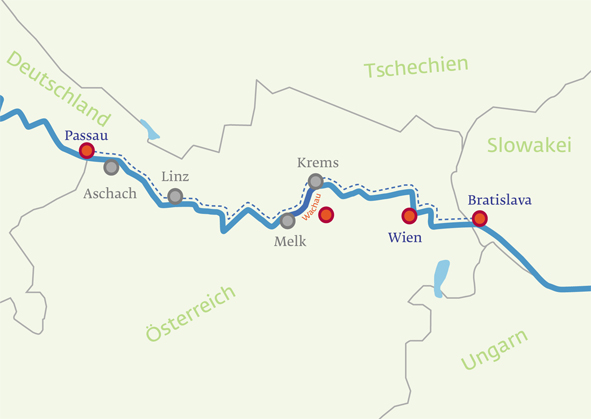 P.S.: Auf der Grafik sehen Sie den Reiseverlauf, den unsere Gruppe mit der A-ROSA Bella hinter sich hat. Von Passau ging es zunächst nach Bratislava, dann zurück über Wien und Krems/Melk wieder nach Passau. Dort beginnt in etwa einer Stunde unser geführter Stadt-Spaziergang.