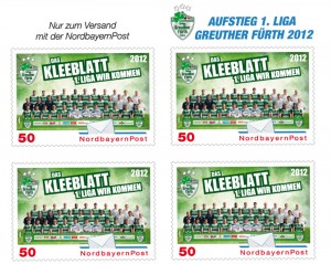 Nach dem VfR Aalen, der gerade in die 2. Fußball-Bundesliga aufgestiegen ist, kommt nun auch die SpVgg Greuther Fürth zu Briefmarken-Ehren: Die „NordbayernPost“ lässt das Team um Trainer Mike Büskens mit einer eigens gestalteten Sonderbriefmarke (Nominalwert: 50 Cent, entspricht dem Standardbrief-Porto der NordbayernPost) zum lang ersehnten Aufstieg in die höchste deutsche Spielklasse hochleben.