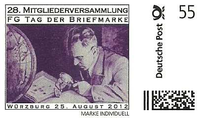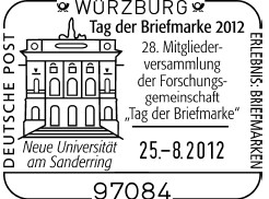 Ein Sonderstempel, zwei Schmuckumschläge und eine Marke Individuell bilden das interessante philatelistische Programm zur 28. Mitgliederversammlung der „Forschungsgemeinschaft Tag der Briefmarke“ vom 24. bis 26. August in Würzburg. Der am 25. August erscheinende Stempel und einer der Umschläge stellen die Neue Universität der Stadt Würzburg vor. Der zweite Umschlag und die Marke Individuell (Frankaturwert 55 Cent) haben ebenfalls einen Bezug zu Würzburg – und gleichzeitig auch zum „Tag der Briefmarke“: Marke und Umschlag-Zudruck zeigen einen Ausschnitt der Sondermarke zum Tag der Briefmarke 1942, für deren Motiv seinerzeit ein Mitglied des „Würzburger Vereins für Briefmarkenkunde von 1880“ Modell stand. 70 Jahre später wird in attraktiver Form daran erinnert – eine schöne Idee.