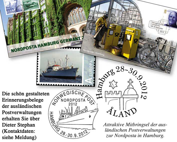 Vom 28. bis 30. September öffnet die alle zwei Jahre in Hamburg stattfindende Nordposta ihre Pforten im Sport- und Freizeitzentrum der HT16 am Sievekingdamm 7. Die Rang-3-Ausstellung präsentiert Sammlungen zahlreicher Sammelgebiete, Info- und Verkaufsstände, einen Jugend-Aktionsbereich und ein interessantes Begleitprogramm (Schwerpunktthema: Polizeiarbeit). Neben der Deutschen Post, die mit vier Sonderstempeln und attraktiven Belegen vor Ort ist, sind auch die Postverwaltungen aus Norwegen, Schweden, Aland und Dänemark mit am Start. Auch sie bringen einige ansehnliche Sonderstempel und Erinnerungsbelege mit. Der Koordinator Nord der „Erlebnis: Briefmarken“-Teams der Deutschen Post, Dieter Stephan, bietet allen BMS-Lesern an, zum Selbstkostenpreis (plus Versandkosten) diese Belege zu beschaffen und gegen Rechnung weiterzuleiten. Wenn Sie diesen ansonsten kostenlosen Service nutzen möchten, schreiben Sie an Dieter Stephan, Windloh 57, 22589 Hamburg, Fax: 040 / 87932618.