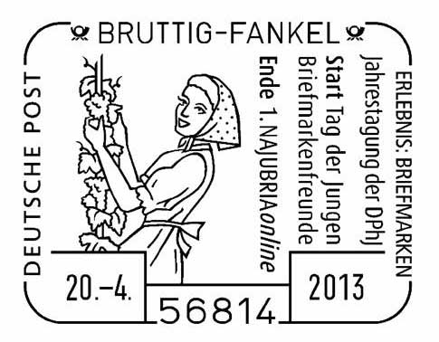 Die Jahreshauptversammlung der Deutschen Philatelisten-Jugend (DPhJ) findet am bevorstehenden Wochenende (20./21. April 2013) in Bruttig an der Mosel statt. Zusammen mit dem Ortsvorsteher des Ortes Bruttig und dem Team „Erlebnis: Briefmarken“ der Deutschen Post wird im Gemeindehaus Bruttig eine Briefmarkenschau organisiert; dazu gibt es ein Sonderpostamt und einen Sonderstempel. Letzterer zeigt die Winzerin aus der Wohlfahrtsbriefmarken-Serie von 1958 und wird auf das Ende der 1. „NAJUBRIAonline“, die noch bis zum Sonntag über die Homepages www.dphj.de und www.najubria.de im Internet erreichbar ist, und den Start der Veranstaltungsreihe zum „Tag der Jungen Briefmarkenfreunde“ hinweisen. Hierzu erscheint außerdem ein Bogen „Marken Individuell“ mit 20 Werten zu je 58 Cent. Die Marken zeigen verschiedene heimische Singvögel – analog zum Thema der Jugendmarken 2013, die im Juni erscheinen werden – sowie Motive aus dem Weinort Bruttig. Weitere Infos hierzu gibt es auf dieser Seite (einfach anklicken). Während der Jahrestagung wird auch ein Nachfolger für den zurückgetretenen 1. Vorsitzenden der DPhJ gewählt.