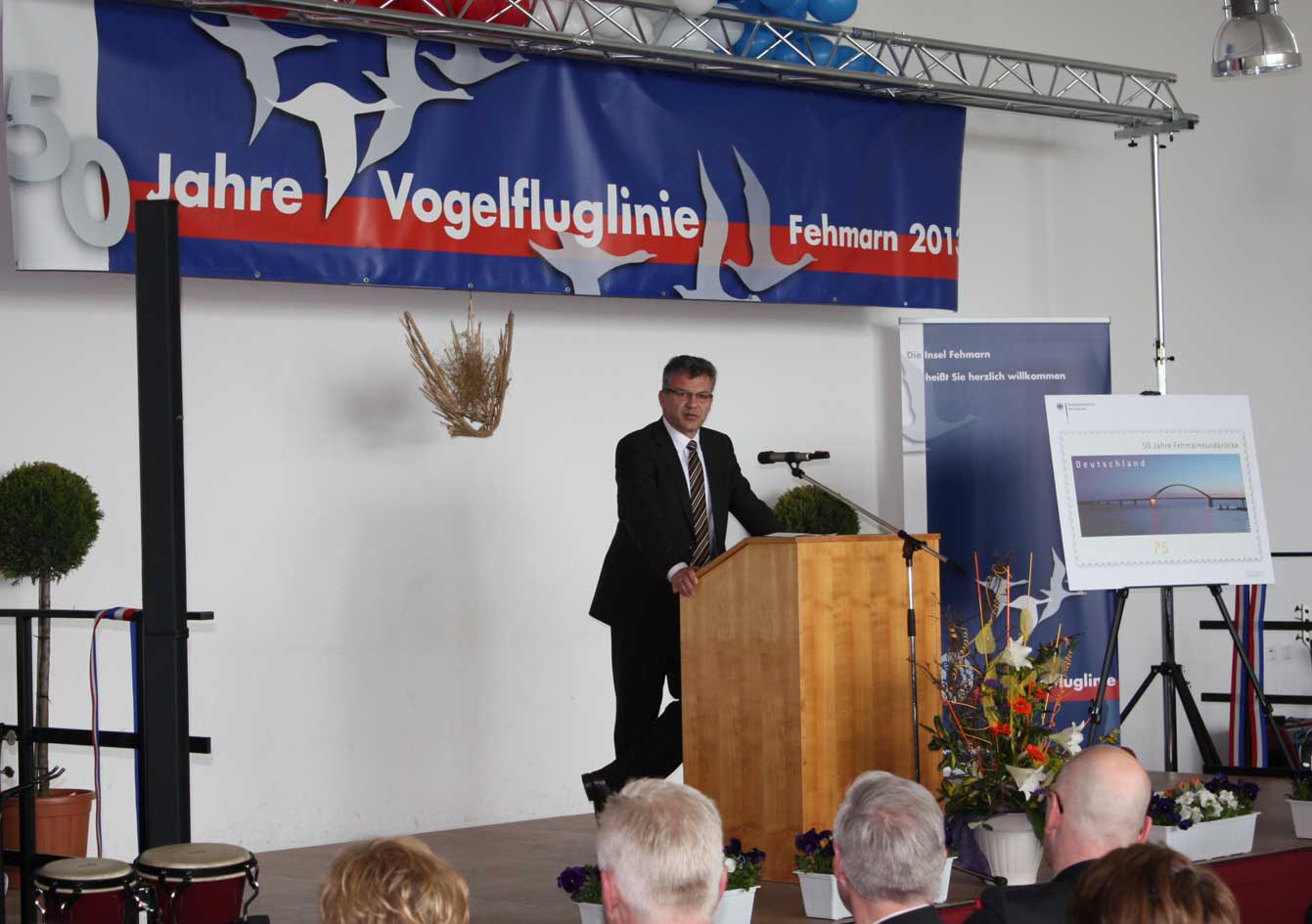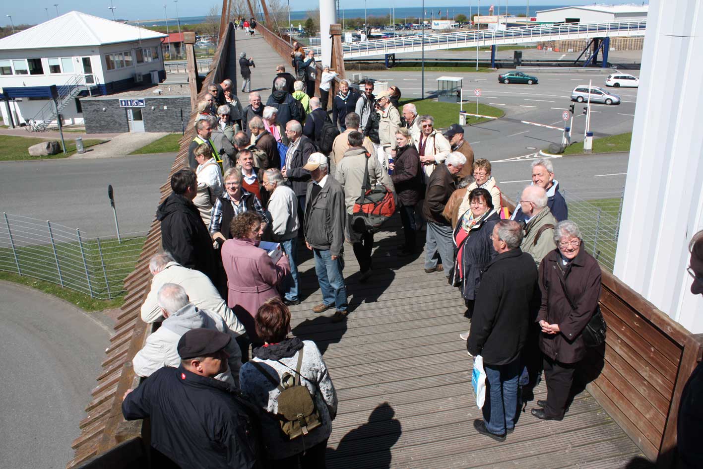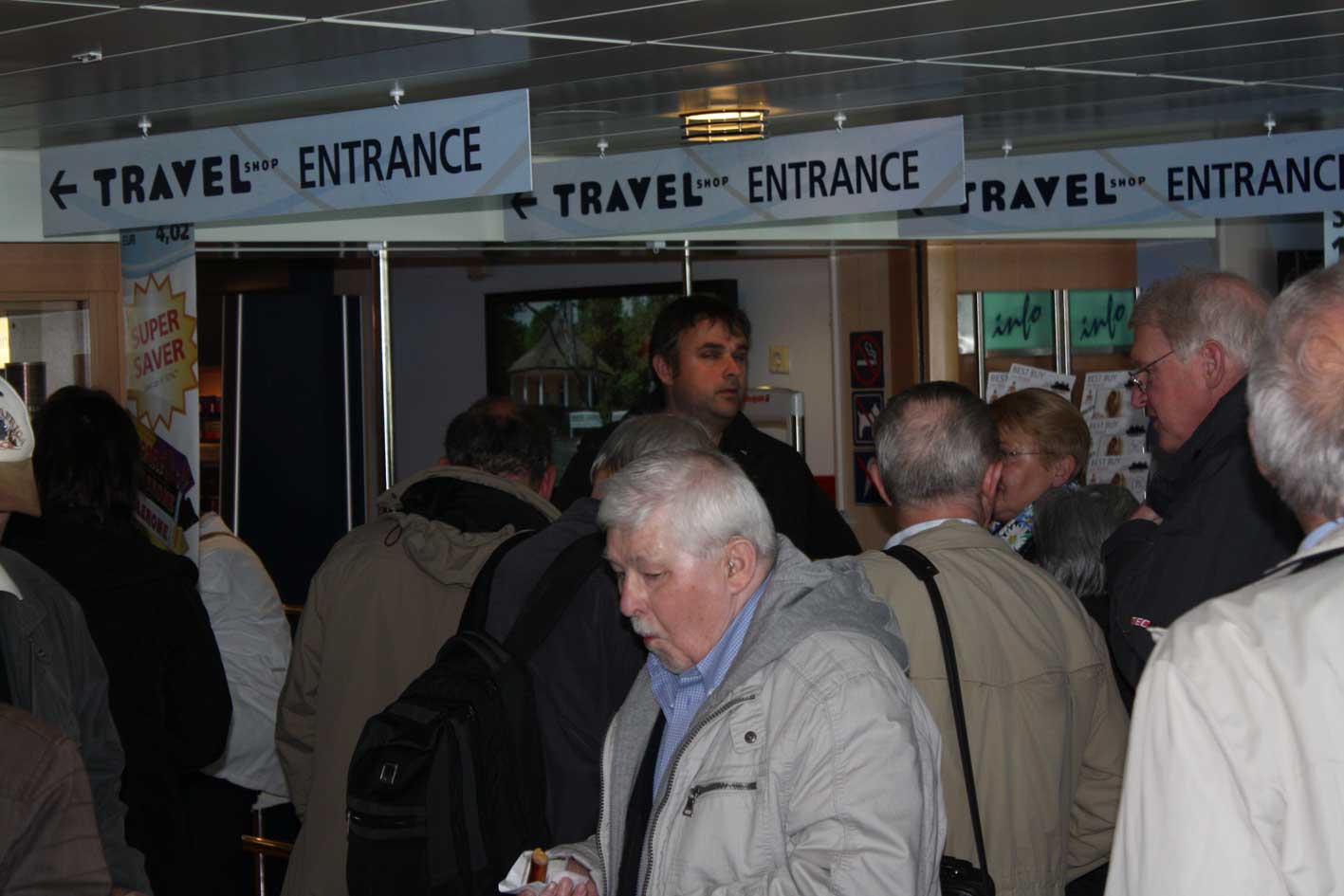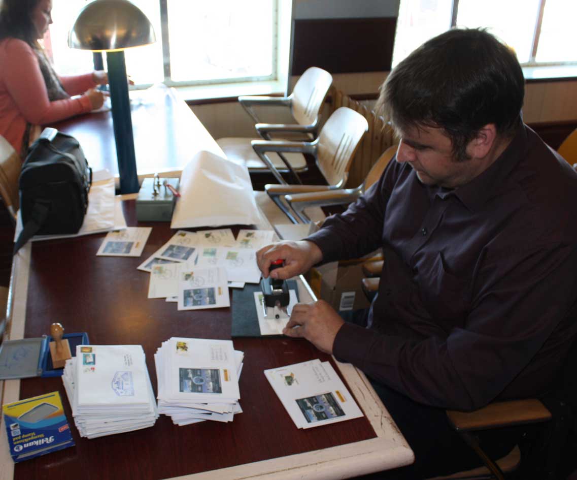 So standen bereits am ersten Tag mehrere Höhepunkte auf dem Plan. Nach einem Fotostopp an der Fehmarnsundbrücke, die an jenem 30. April exakt 50 Jahre alt wurde, und einem gemeinsamen Mittagessen hatte die Gruppe Gelegenheit, an einer sehr aufwendig gestalteten Markenübergabe in Burg auf Fehmarn teilzunehmen. Am Rande dieser Übergabe sorgte ein deutsch-dänisches Postamt für die ersten Beleg-Möglichkeiten. Weitere sollten schon bald folgen, denn an Bord des Fährschiffs „Schleswig-Holstein“, das die Phila-Reisenden von Puttgarden nach Rødby brachte, wurde ein erster Schiffspost-Stempel abgeschlagen – und der war natürlich überaus begehrt.