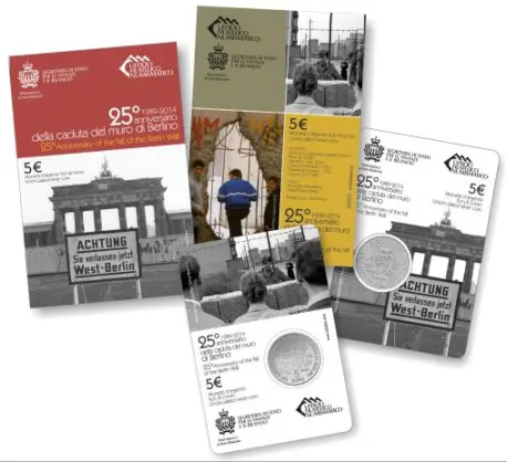Zum 25. Jahrestag des Falls der Berliner Mauer erscheint heute eine Sondermünze, allerdings in San Marino, nicht in Deutschland. Die deutsche Sondermünze zum Jubiläum wird erst im Januar 2015 ausgegeben. Auf der Vorderseite der 5-Euro-Silbermünze in Stempelglanz ist der Schriftzug „Berliner Mauer 1961-1989“ im Zentrum der Berliner Mauer zu sehen. Dahinter erhebt sich das Brandenburger Tor, das berühmteste Denkmal der Stadt. Auf der Rückseite der Münze ist das Wappen von San Marino abgebildet.