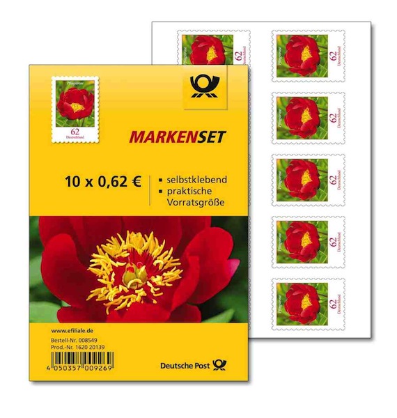 Der Blumen-Wert zu 62 Cent erscheint am 4. Dezember nass- und selbstklebend. Die neue Dauermarke macht ab 2015 die Standardbriefe im Inland frei. Ihre nassklebenden Varianten stammen wie immer aus Rollen und Zehnerbogen. Selbstklebende Pfingstrosen kommen im Folienblatt und in der Rolle an die Schalter. Der 4. Dezember ist auch Ersttag der bereits vorgestelten Blumen-Werte zu 80 und 85 Cent.