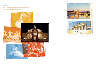 Die erste Gedenkganzsache des Jahrgangs 2015 erscheint am 5. Februar. Der Umschlag mit zwei Wertstempeln erinnert an den 30. Jahrestag der Wiedereröffnung der Dresdner Semperoper. Oben sehen wir einen Sonderwertstempel im Muster der rechten Marke des Zusammendrucks mit dem Dresdner Panorama vom 3. April 2014. Da die Marke 45 Cent kostete, fehlen 17 Cent, die ein Wertstempel im Muster der Automatenmarke mit dem Brandenburger Tor darstellt.