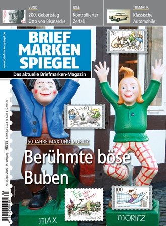 Der eiserne Kanzler wird 200 Jahre alt und viele feiern Otto von Bismarck auch heute noch mit Stempeln oder Schmuckzudrucken, wie zu lesen ist. Schlüssel aus Bremen und Schachfiguren auf Marken stellt Michael Burzan vor. Auf die grüne Insel reist Stefanie Dieckmann in ihrem Bericht „Ganz in Grün“. Luftpost aus Neuseeland, Schifffahrt in der Ostsee, die Privatpost und eine ungewöhnlich große und schwere Silbermedaille sind weitere spannende Themen im neuen Heft.