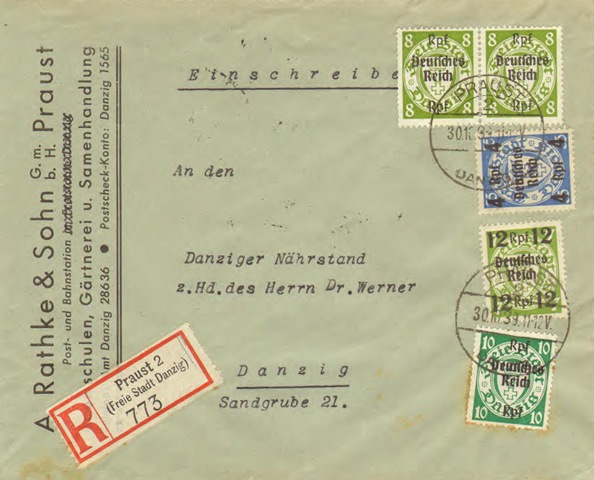 Eingeschriebener Brief aus Praust nach Danzig. Der seltene Stempel PRAUST 2 / DANZIG vom 30. Oktober 1939 ist bekannt zwischen dem 5. und 30. Oktober 1939. Er weist die Uhrzeit in zwölf Stunden mit Angabe „V“ und „N“ aus und nicht, wie in Danzig üblich, in 24 Stunden. Das Porto betrug ab 1. Oktober 1939 für den Brief 12 Pfennig und für die Zusatzleistung Einschreiben 30 Pfennig, zusammen 42 Pfennig.