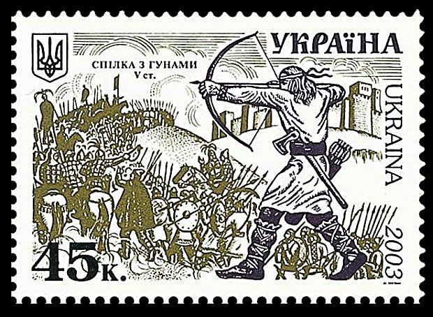 Hunnen auf einer Briefmarke der UkraineHielte man an dieser Stelle inne, stünden wir vor einem filmreifen „Happy End“. Beide Seiten profitierten von der Unterstützung des anderen, man half sich aus ganz konkreten Notsituationen. Warum aber wendete sich das Blatt? Der gotische Chronist Jordanes, der knapp 200 Jahre später die Geschichte seines Volkes niederschrieb, machte die „verdammte Gier nach Gold“ dafür verantwortlich. Römische Verwaltungsoffiziere hätten die Notsituation der hungernden Goten schamlos ausgenutzt und ihnen verdorbene Lebensmittel zu horrenden Preisen verkauft. Sogar die Kinder der Flüchtlinge hätten sie als Preis verlangt. Was Jordanes in seinem Text schilderte, konnte er nur vom Hörensagen übernommen haben, einen Kern Wahrheit darf man aber darin vermuten. Zumindest kam es bald zu Handgreiflichkeiten zwischen den Goten und den Römern, die in der Schlacht von Adrianopel am 9. August 378 gipfelten. Der römische Kaiser Valens fiel zusammen mit einem Großteil seiner Soldaten …