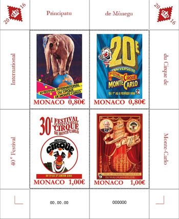 Jedes einzelne Jubiläum des Festivals zelebriert Monaco mit besonderen Briefmarken: Am Dienstag, 5. Januar, erscheinen die Festivalplakate der Vergangenheit als Briefmarkenmotive unter dem Titel „ 40. Fest des Zirkus von Monte Carlo“. Das zehnte Jubiläum wird mit einem Elefanten auf der Weltkugel bebildert, das 20.ste zeigt die Jubiläumszahl mit einem Clown, beim 30.sten steht ebenfalls ein Clown im Mittelpunkt und zum aktuell 40.sten Jubiläum wird neben einem Zirkusvorhang an den Gründer Fürst Rainier III erinnert. Die Briefmarken erscheinen zweimal im Wert von 0,80 Euro und zweimal zu 1,00 Euro.