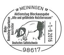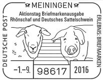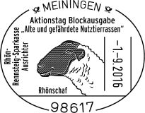 Der Meininger Briefmarkensammlerverein (BSV) ist im September besonders umtriebig. Auf Initiative des Vereins und nach einjähriger Vorarbeit kommt nun das Rhönschaf zu philatelistischen Ehren: Am 1. September ist die Blockausgabe der Sonderpostwertzeichen „Rhönschaf“ (70 Cent) und „Deutsches Sattelschwein“ (85 Cent) erschienen. Der Meininger BSV begleitet die Ausgabe mit einem Belegprogramm, und es gibt viele Veranstaltungen: Am 1. September fand ein Aktionstag mit Sonderstempeln statt, am 11. September wird der Tag der Briefmarke in Kaltenwestheim, verbunden mit den Naturerlebnistagen des Biosphärenreservats Rhön sowie der 5. Rhöner Ziegenpost, begangen und am 15. September ab 13 Uhr sind Vertreter des Bundesfinanzministeriums in Kaltenwestheim zu Gast.