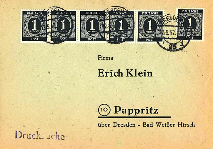 Den wahren Reiz machen für Kenner bei MiNr. 911 portorichtige Mehrfachfrankaturen aus. In den Michel-Briefe-Katalogen aus den 1980er-Jahren wurde noch nicht differenziert, für welche Portostufen die Bewertung gelten sollte. Immerhin kletterte sie von 40 Mark in der zweiten Auflage 1981 auf 100 Mark in 1989. Doch auch im vergangenen Jahrzehnt dokumentieren die Katalogbände einige erhebliche Steigerungen bei der Einstufung nach mittlerweile sechs Portosätzen. Am häufigsten findet man die Verwendung von sechs Marken zu einem Pfennig auf Standard-Drucksachen der zweiten Portoperiode, die bereits ab 1. März 1946 begann – sie haben sich stabil auf 100 Euro gehalten. Bei Peter Harlos brachte ein solcher Beleg 2016 einen Zuschlag von 32 Euro Plus Aufgeld. Ein leicht gebräuntes Kuvert ohne Absender wurde bei Hadersbeck zu 25 angesetzt. Bei Rosslau schloss eine Drucksache mit 60 Euro, verschickt aus „JÜGESHEIM ?a? 5.4.47“ nach Nassau, wobei der Umschlag vorschriftsgemäß unverschlossen blieb. 90 Euro erzielte das Württembergische Auktionshaus für eine tadellose Drucksache ab Pössneck vom 12.11.1946, freigemacht mit einem Viererblock und einem waagerechten Oberrandpaar als „seltene, reine Mehrfachfrankatur“.