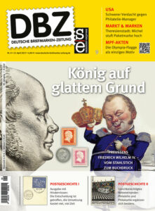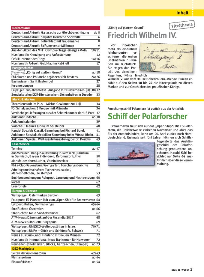 Am 13. April 2017 kommt die aktuelle Ausgabe der Deutschen Briefmarken-Zeitung in den Zeitschriftenhandel. Zum abwechslungsreichen Inhalt gehören wie üblich viele interessante und abwechslungsreiche Beiträge aus unterschiedlichen Bereichen der Sammlerwelt. Das Titelthema steht diesmal ganz im Zeichen von Friedrich Wilhelm IV. und den ersten Briefmarken Preußens im Buchdruckverfahren. Die Polarforscher sind natürlich auch wieder unterwegs und auch Neuheiten im Bereich Briefmarken und Stempel sowie Automatenmarken werden wieder präsentiert. Nicht fehlen dürfen natürlich auch die aktuellen Auktionstermine und es gibt neue Folgen in den Themenserien, wie etwa „Für Schatzsucher“ oder „Aus den Akten des MPF“.