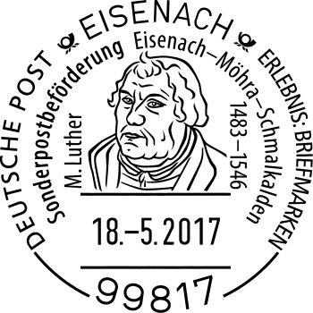 Der Briefmarken-Sammler-Verein „Smalcalda“ hat dazu ein Sonderpostamt im Lutherhaus Eisenach und einen Sonderstempel organisiert. Aufgelegt werden Schmuckpostkarten, die bereits vorher verkauft werden. Am 18. Mai sind diese von 10 bis 16 Uhr auch im Lutherhaus in Eisenach erhältlich und können gleich mit dem Sonderstempel versehen werden.