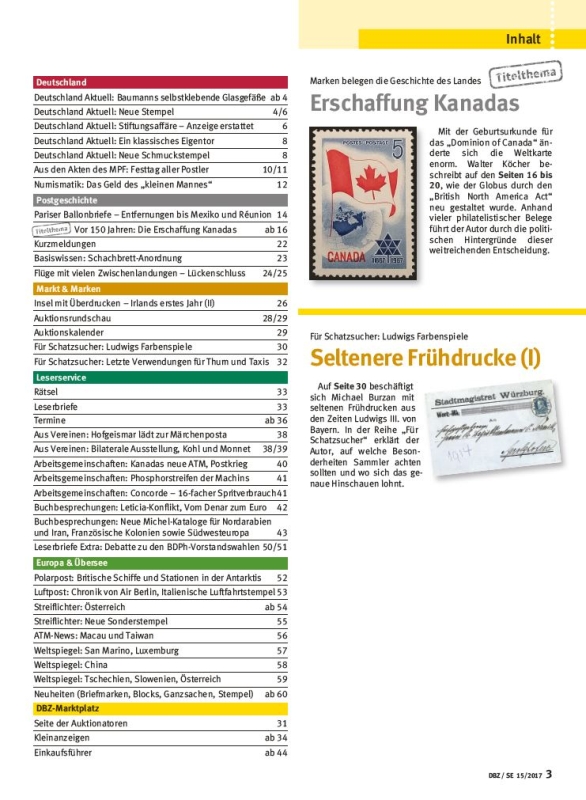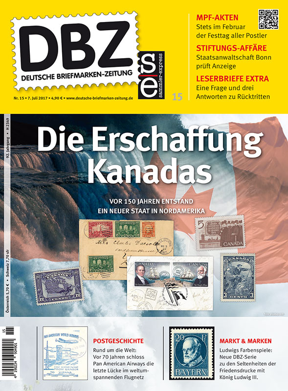 Die aktuelle Ausgabe der Deutschen Briefmarken-Zeitung kommt am 7. Juli 2017 in die Regale des Zeitschriftenhandels. Das erste Juli-Heft liefert abwechslungsreiche Artikel aus der bunten Welt der Philatelie und der Numismatik. Kanada liefert den Inhalt zu Walter Köchers Titelthema. Er erklärt, wie dieses große Land den Sprung auf den Globus schaffte. Im Bereich Markt und Marken verschafft Michael Burzan dem Leser Einblicke in viele Bereiche, wie zum Beispiel die „Selteneren Frühdrucke“, die sich mit „Ludwigs Farbenspiele“ befassen. Darüber hinaus stellt das Heft wie gewohnt Neuheiten im Bereich Briefmarken und Stempel sowie Automatenmarken und Münzen vor. Zudem gibt es neue Folgen der fortlaufenden Themenserien, wie etwa „Basiswissen“ oder „Aus den Akten des MPF“. Beim Rätsel locken wieder attraktive Preise. In der Rubrik Postgeschichte gibt es auch weiterführendes Expertenwissen und natürlich fehlen auch die aktuellen Auktionstermine und viele Einkaufstipps nicht.