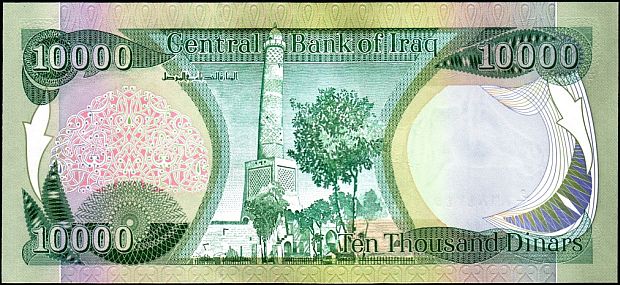 Die 500er-Marke zeigt einziehende Armeeeinheiten mit dem 45 Meter hohen Minarett al-Hadba der Großen Moschee des an-Nuri im Hintergrund. Die im 10. Jahrhundert errichtete Moschee und der Turm für den Gebetsrufer zieren bereits die Rückseite der 10.000 Dinar-Banknote.