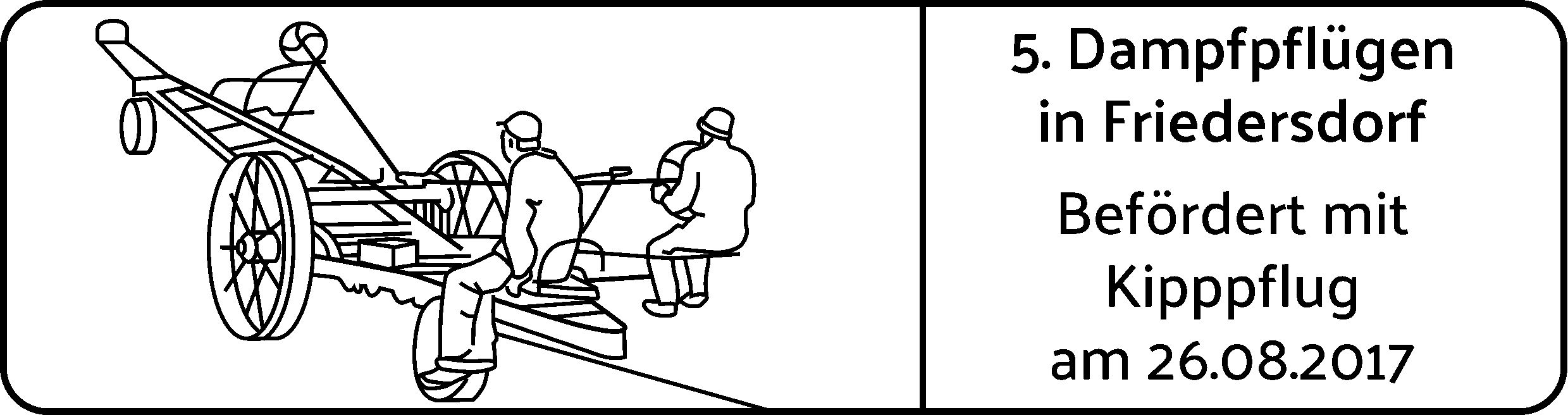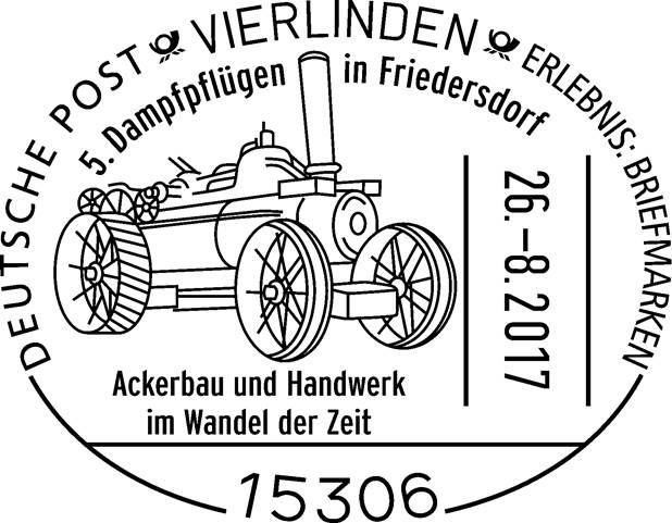 Am 26. und 27. August 2017 veranstaltet der Freundeskreis Friedersdorf ab 10 Uhr das fünfte Dampfpflügen unter dem Motto: „Ackerbau und Handwerk im Wandel der Zeit“. Der Freundeskreis des gleichnamigen Guts im brandenburgischen Vierlinden richtet gemeinsam mit dem Philatelistenklub Seelow und dem „Erlebnis: Briefmarken“-Team Berlin aus diesem Anlass am 26. August ein Sonderpostamt mit Sonderstempel aus.
