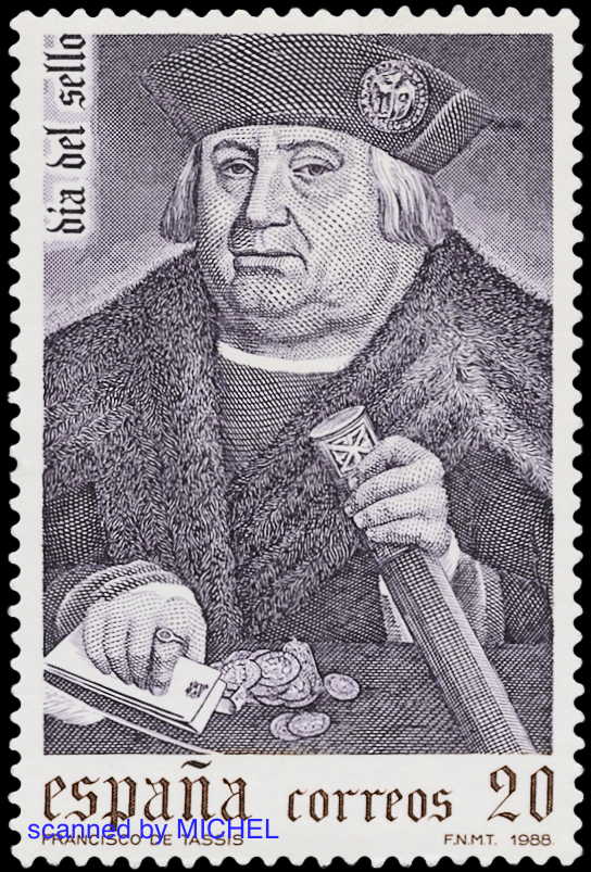 Von einem unbekannten Frankfurter Meister stammt das im frühen 16. Jahrhundert gefertigte Tafelbild mit dem Porträt Franz von Taxis, der in der rechten Hand zwei Faltbriefe hält. Reproduziert wurde es unter anderem auf Sondermarken Spaniens und Deutschlands, daneben auf der Marke eines belgischen Blocks, MiNr. 2826, 535 und Block 3 (Abb. Schwaneberger Verlag).