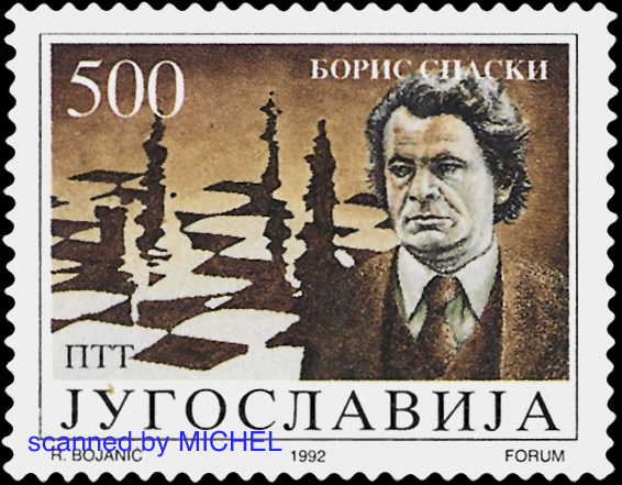 1992 trafen sich Fischer und Spasski zum Revanchematch inmitten des jugoslawischen Krieges in Belgrad (MiNr. 2559 und 2560).