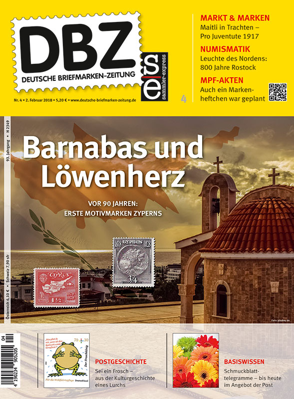 90 Jahre Motivmarken von Zypern sind Titelthema der Deutschen Briefmarken Zeitung 4/2018. Unter der Überschrift „Barnabas und Löwenherz“ widmet sich Walter Köcher diesem Sammelgebiet. Und lurchig geht´s beim Beitrag von Dieter Heinrich zu – Applaus! Applaus! Apllaus!