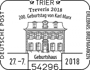 Vom 27. bis zum 29. Juli lädt der Deutsch-Französische Briefmarkenclub Trier zur Treveris 2018 in die Badmintonhalle des FSV Tarforst. An die Rang-2-Ausstellung ist eine Rang-3- Schau plus Jugendklasse angeschlossen. Die Sonderstempel zeigen das Geburtshaus und ein Portrait des jungen Karl Marx, dessen Geburtstag sich in diesem Jahr zum 200. Mal jährt.