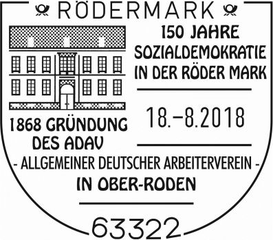 Das Stempelmotiv zeigt das alte Rathaus von Ober-Roden und die Beschriftung, „150 JAHRE SOZIALDEMOKRATIE IN DER RÖDER MARK – 1868 GRÜNDUNG DES ADAV -ALLGEMEINER DEUTSCHER ARBEITERVEREIN- IN OBER-RODEN“. Im Kuvert finden sich zwei Seiten; einmal zur Geschichte der Entstehung des Allgemeinen Deutschen Arbeitervereins 1868 in Ober-Roden, zweitens zur Röder Mark.