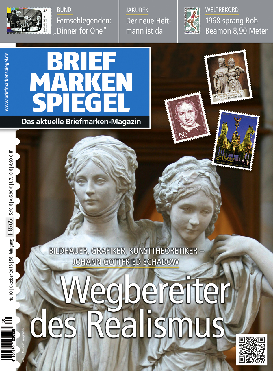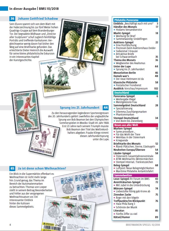 Abwechslung und Information sind garantiert in der Oktober-Ausgabe des BRIEFMARKEN SPIEGEL: Autor Dieter Heinrich lässt Johann Gottfried Schadow zu philatelistischen Ehren kommen. Sein Werk reicht von dem Blatt mit der Federzeichnung bis zur fünf Meter hohen Quadriga-Gruppe auf dem Brandenburger Tor. Sportlich geht´s zu beim Beitrag von Frauke Klinge: Sie skizziert das Leben der Weitsprunglegende Bob Beamon. Außerdem beinhaltet der BMS eine ausführliche Analyse der österreichischen Weihnachtsmarken von 2017.