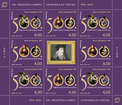 Viele Nationen erinnern anlässlich des 500. Todestages von Leonardo da Vinci an das umfangreiche Vermächtnis des Universalgelehrten, der seiner Zeit weit voraus war. Auch auf Sonderbriefmarken der Kroatischen Post in Bosnien wird der Meister durch einem achtteiligen Kleinbogen mit Porträt und zwei Werten zu je vier Konvertibler Mark gewürdigt.