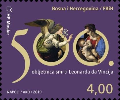 Bei ihrer Motivauswahl fokussierte sich die Post im Mostar auf Leonardo als Wegbereiter der Malerei. Im Zentrum der beiden Leonardo-Marken steht die Jubiläumszahl 500. Die Nullen erinnern an Schiffsbullaugen. Hieraus blicken die Protagonistinnen der Gemälde Leonardos hervor: Der Erzengel Gabriel, die stillende Madonna mit Kind, die Mona Lisa und die Dame mit dem Hermelin wie bei einer Seereise. Der Wert mit der Mona Lisa und der Hermelin-Dame ist unsere Briefmarke des Monats Juli.