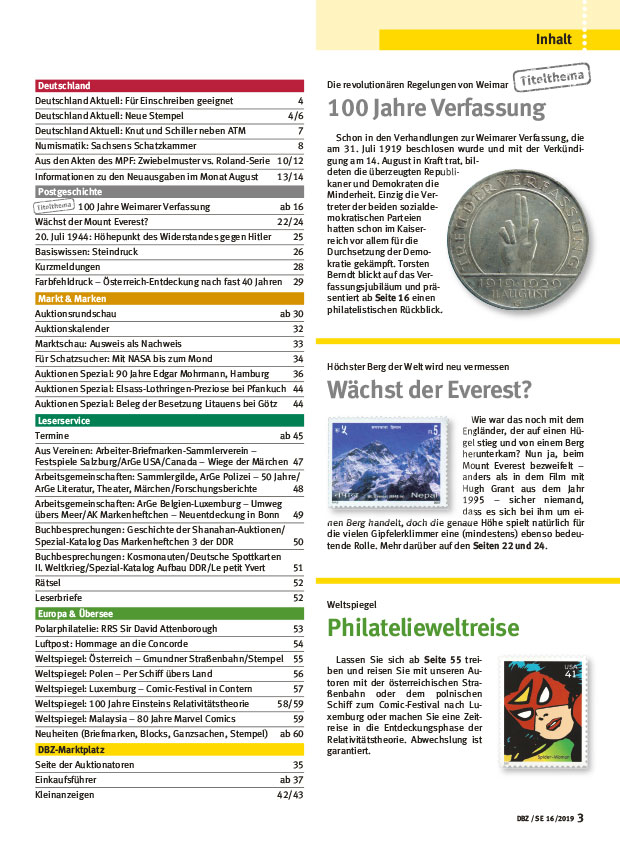 Sie möchten noch mehr über das neue Heft wissen? Dann schauen Sie ins Inhaltsverzeichnis am Fuße dieser Seite. Wie gewohnt liefert die DBZ einen Überblick über die Auktionsszene im deutschsprachigen Raum und regelmäßig erscheinende Beiträge aus den Themengebieten Briefmarken-Neuheiten, Stempel, Automatenmarken u.v.m. sind wie immer auch in der aktuellen Ausgabe vertreten. In der Rubrik Postgeschichte gibt es ebenfalls weiterführendes Spezialwissen. Abwechslung ist also wie immer garantiert. Das Heft 16/2019 kommt am 19. Juli 2019 in die Regale des Zeitschriftenhandels.