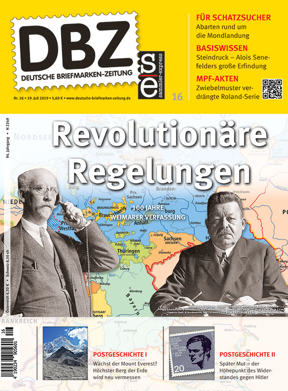 Ab morgen ist die Deutsche Briefmarken Zeitung Ausgabe 16/2019 mit vielen interessanten Themen erhältlich. Hier eine kleine Vorschau auf den Inhalt der zweiten Juli-Ausgabe: Vor 100 Jahren trat die Weimarer Verfassung in Kraft, die bis heute ihre Strahlkraft nicht verloren hat. Außerdem stellt sich die Frage, ob ein Berg wachsen kann und selbstverständlich spielt auch die spektakuläre Mondlandung vor 50 Jahren wieder eine Rolle im Heft. Die übliche Schatzsuche, Aktuelles aus den Vereinen und Arbeitsgemeinschaften sowie vieles andere mehr runden das Heft ab.