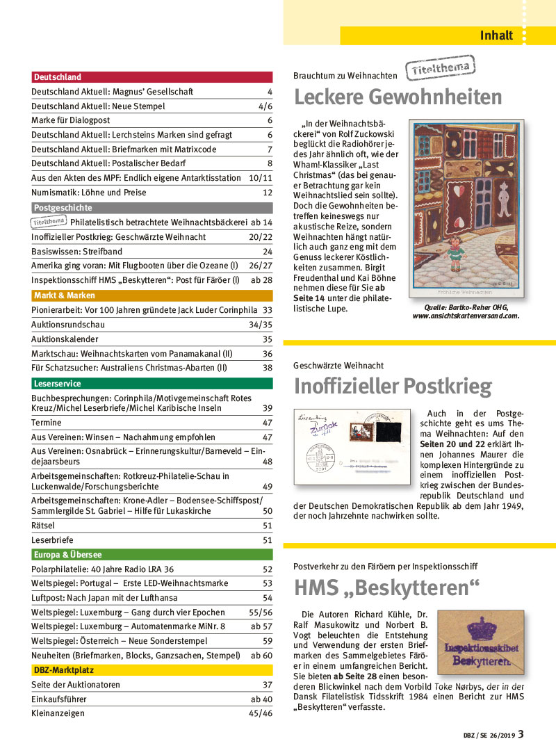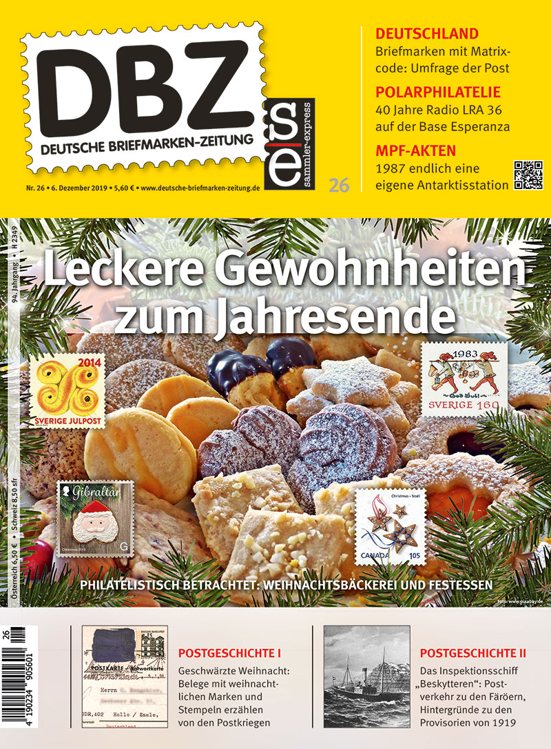 Es weihnachtet vom Panamakanal bis nach Australien und von der deutsch-deutschen Grenze bis zur wiedervereinigten Weihnachtsbäckerei. In der neuen DBZ dreht sich vieles um die festlichsten Tage des Jahres. Ab heute gibt es die Deutsche Briefmarken Zeitung Ausgabe 26/2019 im Zeitschriftenhandel. Freuen Sie sich in der neuen Ausgabe Ihrer DBZ aber auch auf viele lesenswerte Beiträge, die sich anderen Themenbereichen widmen und wie immer haben unsere Autoren viele weitere spannende Themen in Deutschland, Europa und der ganzen Welt recherchiert. Aktuelles aus Vereinen und Arbeitsgemeinschaften, die Neuausgaben des kommenden Monats und die MPF-Akten lesen sie natürlich auch in Heft 26.