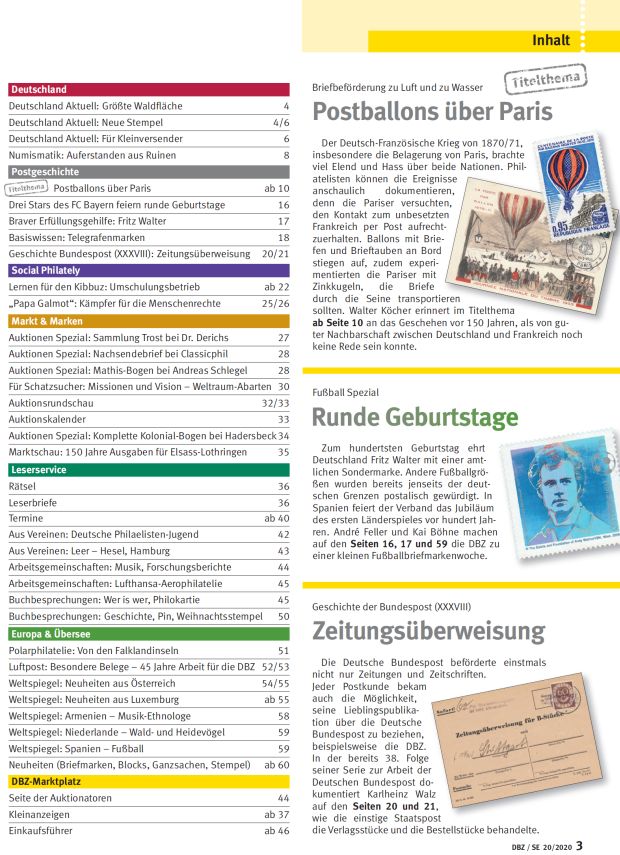 Auch die neue Ausgabe der Deutschen Briefmarken-Zeitung wartet mit einem breiten Angebot unterschiedlicher Themen auf. Das Titelthema von Walter Köcher befasst sich mit der Briefbeförderung per Postballon über Paris. Und während die Internationalen Fußballligen verspätet auf Ihren Saisonstart warten oder ihn zum Teil auch schon absolviert haben, widmen sich André Feller und Kai Böhne einigen grauen Eminenzen des Sports und auch der spanische Fußball findet im Weltspiegel seinen Platz. Dieser umfangreiche Weltspiegel entführt Sie außerdem in dieser Ausgabe nach Österreich, in die Niederlande, nach Luxemburg und Armenien. Wie immer haben unsere Autoren auch alles Wichtige aus Deutschland und den Nachbarländern gesammelt und informieren außerdem über Aktuelles aus Vereinen und Arbeitsgemeinschaften sowie die Neuausgaben des kommenden Monats.