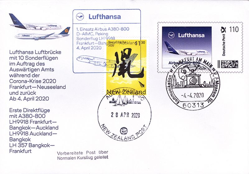 Die ILA dokumentierte zwei Flüge, mit denen die Lufthansa Reisende zurückholte, philatelistisch: Als im Frühjahr die Coronakrise ausbrach, musste die Lufthansa zahlreiche Reisende aus dem Ausland zurückholen. Europäische Ziele steuerten die Flieger ebenso an wie Länder in Übersee. Zu den Destinationen mit den meisten Flugkilometern dürften die Verbindungen von Frankfurt am Main nach Auckland und Christchurch in Neuseeland zählen.