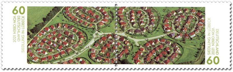 Die Deutsche Post beginnt das Jahr 2021 am 7. Januar mit dem zweiten Teil der Serie „Deutschland von oben“. Nachdem es am 2. Juli 2020 um das Freibad der nordrheinwestfälischen Stadt Witten ging, ist auf zwei Sondermarken, die einen Zusammendruck bilden, diesmal eine Wohnsiedlung in Lübeck, Schleswig-Holstein, zu sehen.