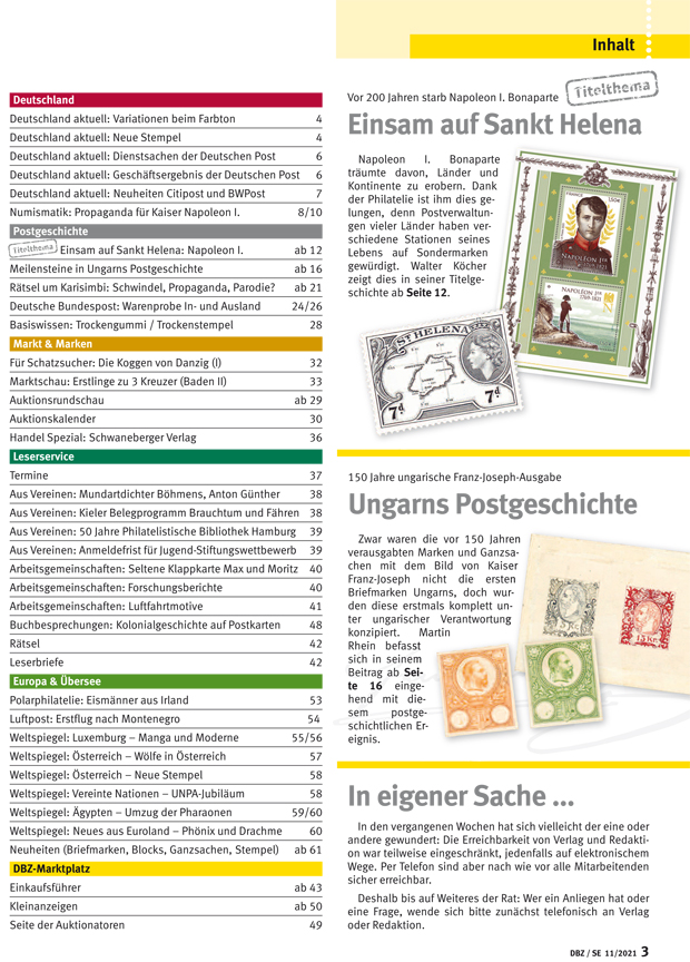Napoleon I. Bonaparte träumte davon, Länder und Kontinente zu erobern. Dank der Philatelie ist ihm dies gelungen, denn Postverwaltungen vieler Länder haben verschiedene Stationen seines Lebens auf Sondermarken gewürdigt. Walter Köcher zeigt dies in seiner Titelgeschichte ab Seite 12.