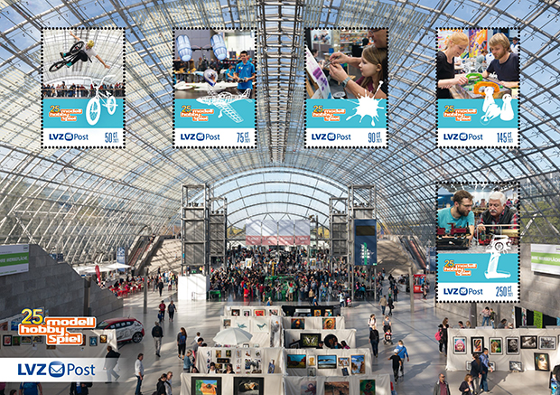 Kleinbogen der LVZ Post Leipzig zur 25. Ausgabe der Messe „modell- hobby-spiel“ auf dem Gelände der Leipziger Messe im Oktober 2021.