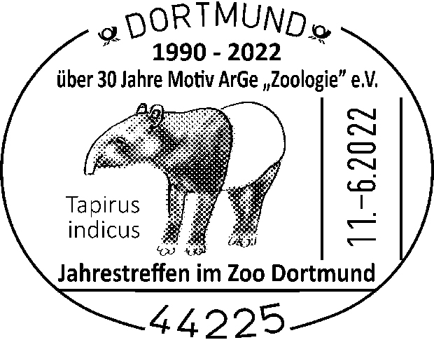 Der Tapir ziert seit vielen Jahren das Logo der ArGe und wurde anlässlich der Veranstaltung vom Vorsitzenden der ArGe, Kurt Gronwald, überarbeitet. Die im Zudruck der Ganzsache abgebildeten Tiere werden allesamt im Zoo Dortmund gehalten. Neben dem Schabrackentapir sind Löwen, Erdmännchen, Breitmaulnashörner sowie eine sehr seltene und vom Aussterben bedrohte Kordofan-Giraffe namens Maoli auf den Abbildungen zu sehen.