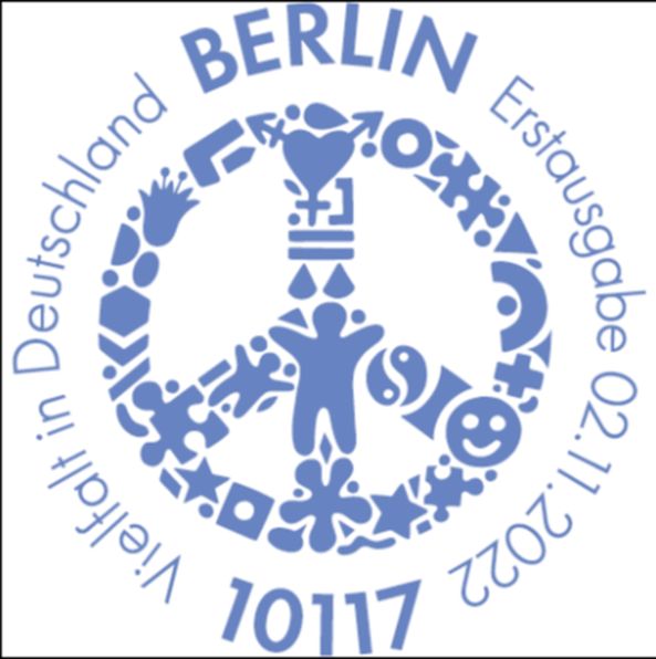 Eine farbenfrohe Sondermarke der Deutschen Post betont, dass die Akzeptanz von Diversität eine Bereicherung für Gesellschaften darstellt, MiNr. 3727.