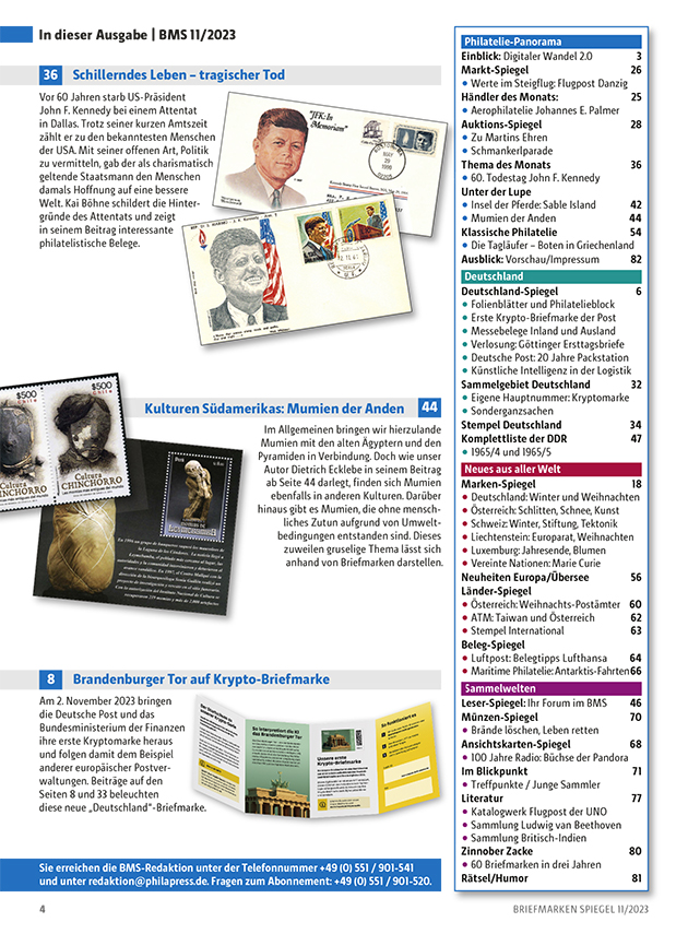 Am 2. November 2023 bringen die Deutsche Post und das Bundesministerium der Finanzen ihre erste Kryptomarke heraus und folgen damit dem Beispiel anderer europäischer Postverwaltungen. Beiträge auf den Seiten 8 und 33 beleuchten diese neue „Deutschland“-Briefmarke.