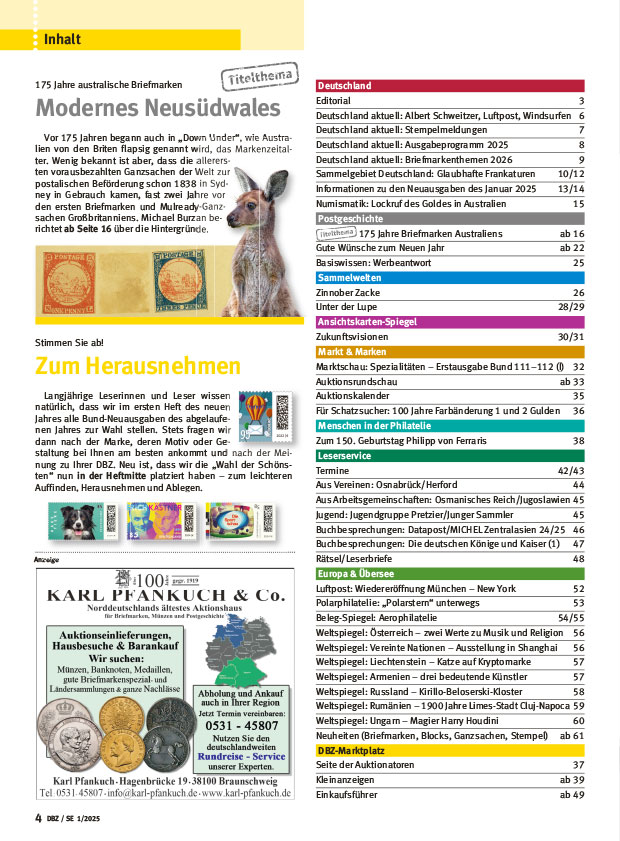 Dazu gibt es Neuigkeiten, Auktionsberichte, Neuheitenmeldungen, Buchbesprechungen, Termine und vieles mehr. Was, das verrät Ihnen ein Blick ins Inhaltsverzeichnis. Abonnenten erhalten das Heft bereits etwas eher, können schon einige Tage früher darin lesen – und sparen außerdem Geld gegenüber dem Kauf im Einzelhandel. DBZ01-2025_australien-dbz-bms-bundestag-Frankatur-porto_03