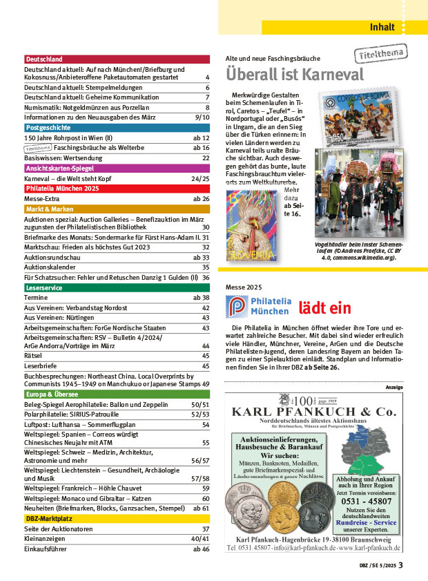 Dazu gibt es Neuigkeiten, Auktionsberichte, Neuheitenmeldungen, Buchbesprechungen, Termine und vieles mehr. Was, das verrät Ihnen ein Blick ins Inhaltsverzeichnis. Abonnenten erhalten das Heft bereits etwas eher, können schon einige Tage früher darin lesen – und sparen außerdem Geld gegenüber dem Kauf im Einzelhandel.