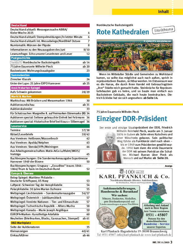 Dazu gibt es Neuigkeiten, Auktionsberichte, Neuheitenmeldungen, Buchbesprechungen, Termine und vieles mehr. Was, das verrät Ihnen ein Blick ins Inhaltsverzeichnis. Abonnenten erhalten das Heft bereits etwas eher, können schon einige Tage früher darin lesen – und sparen außerdem Geld gegenüber dem Kauf im Einzelhandel.