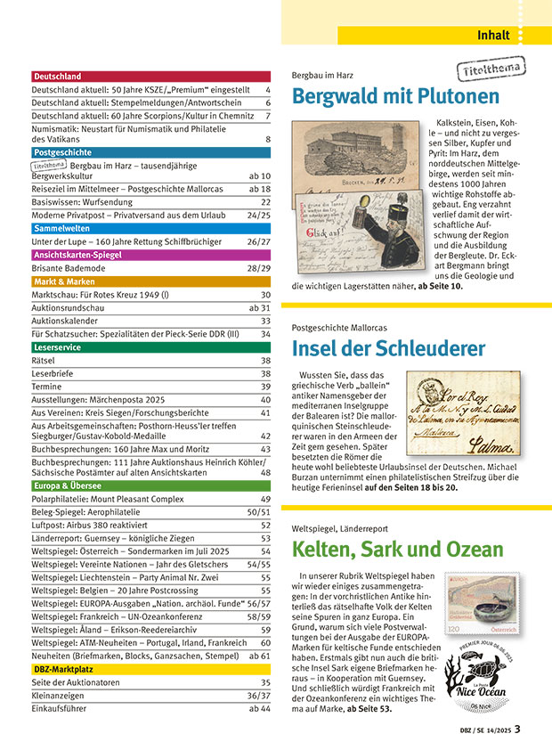 Dazu gibt es Neuigkeiten, Auktionsberichte, Neuheitenmeldungen, Buchbesprechungen, Termine und vieles mehr. Was, das verrät Ihnen ein Blick ins Inhaltsverzeichnis. Abonnenten erhalten das Heft bereits etwas eher, können schon einige Tage früher darin lesen – und sparen außerdem Geld gegenüber dem Kauf im Einzelhandel.