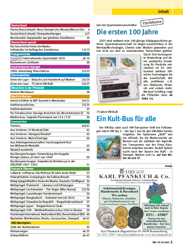 2025 wird weltweit eine 100-jährige Erfolgsgeschichte gefeiert. Quantenwissenschaft ist längst unverzichtbar in der Werkstofftechnologie, Chemie oder Medizin geworden und hat nicht nur dort zu revolutionären Fortschritten geführt. Durch ihre konsequente Anwendung und deren praktische Umsetzung für Produkte entstanden im 20. Jahrhundert zahllose hilfreiche Technologien für die Gesellschaft. Wir alle profitieren z.B. von Elektronik, Photonik und vielem mehr. Michael Schilling zeigt die Philatelie dazu ab Seite 14.