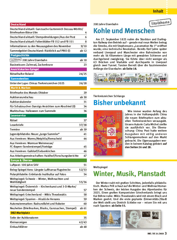 Der Winter naht mit großen Schritten, jedenfalls philatelistisch. Marius Prill schaut auf die Winter- und Weihnachtsmarken der Schweiz, der letzten Ausgabe des Alpenlandes für 2025. Einen großen Komponisten Griechenlands bringt uns Kai Böhne nahe: Mikis Theodorakis wird mit einem Block und Marken geehrt. Und die erste geplante (Universitäts-)Stadt der Welt stellt uns Dietrich Ecklebe vor – reisen Sie mit uns nach Spanien: ab Seite 55.