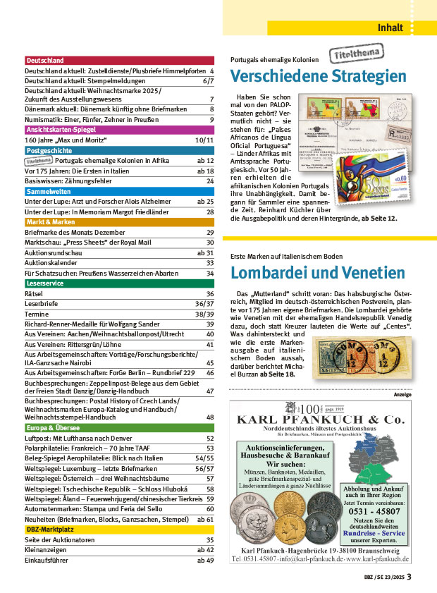 Dazu gibt es Neuigkeiten, Auktionsberichte, Neuheitenmeldungen, Buchbesprechungen, Termine und vieles mehr. Was, das verrät Ihnen ein Blick ins Inhaltsverzeichnis. Abonnenten erhalten das Heft bereits etwas eher, können schon einige Tage früher darin lesen – und sparen außerdem Geld gegenüber dem Kauf im Einzelhandel. dbz23-25_kolonie_alzheimer_preussen_busch_03
