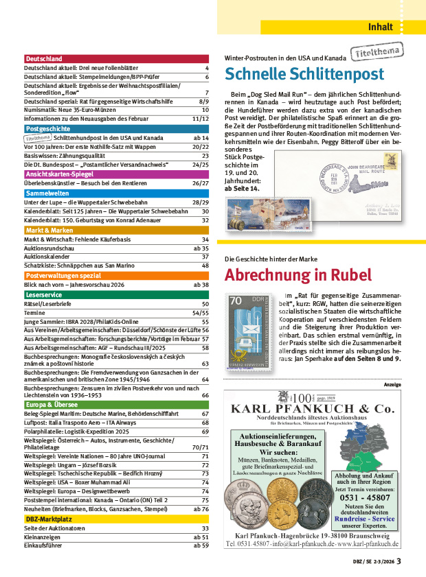 Beim „Dog Sled Mail Run“ – dem jährlichen Schlittenhunderennen in Kanada – wird heutzutage auch Post befördert; die Hundeführer werden dazu extra von der kanadischen Post vereidigt. Der philatelistische Spaß erinnert an die große Zeit der Postbeförderung mit traditionellen Schlittenhundegespannen und ihrer Routen-Koordination mit modernen Verkehrsmitteln wie der Eisenbahn. Peggy Bitterolf über ein besonderes Stück Postgeschichte im 19. und 20. Jahrhundert: ab Seite 14.