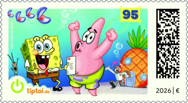 Eine Sondermarke vom 2. März 2026 zeigt die Zeichentrickfigur Sponge Bob. Es handelt sich um das zweite Sonderpostwertzeichen des Bundesministeriums der Finanzen mit tiptoi®-Funktion: Wie bei speziellen Kinderbüchern des Verlags Ravensburger, erklingen verschiedene Stimmen und Lieder, wenn man einen tiptoi®-Stift über das Motiv bewegt. Zuvor muss der Stift, ein digitales Medium, mit einer Audiodatei bespielt werden, die Käufer auf der Webseite tiptoi.de herunterladen können.